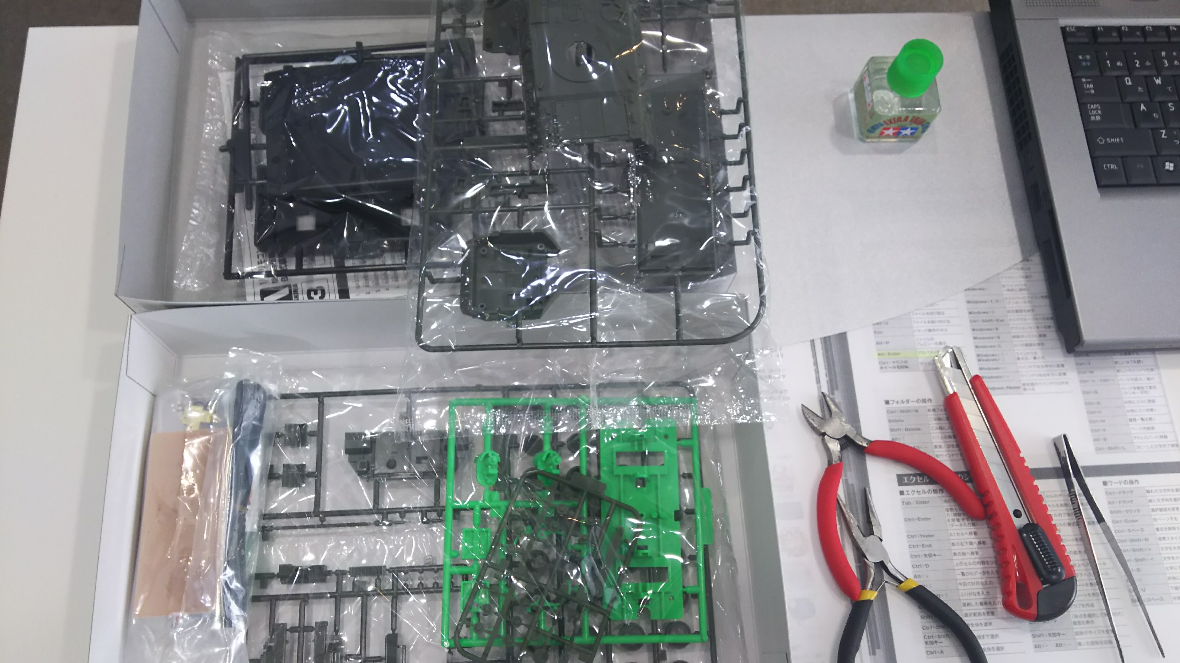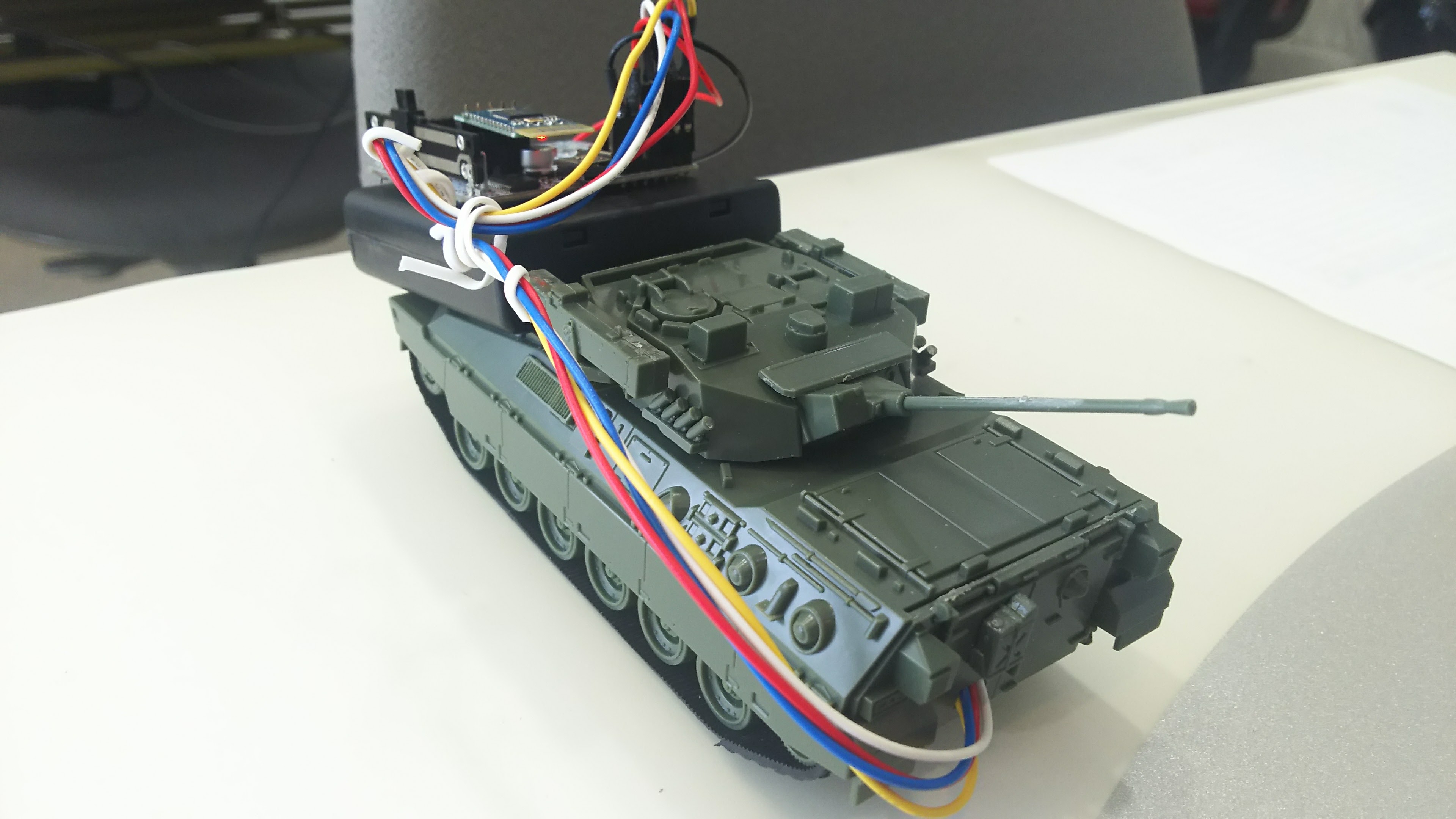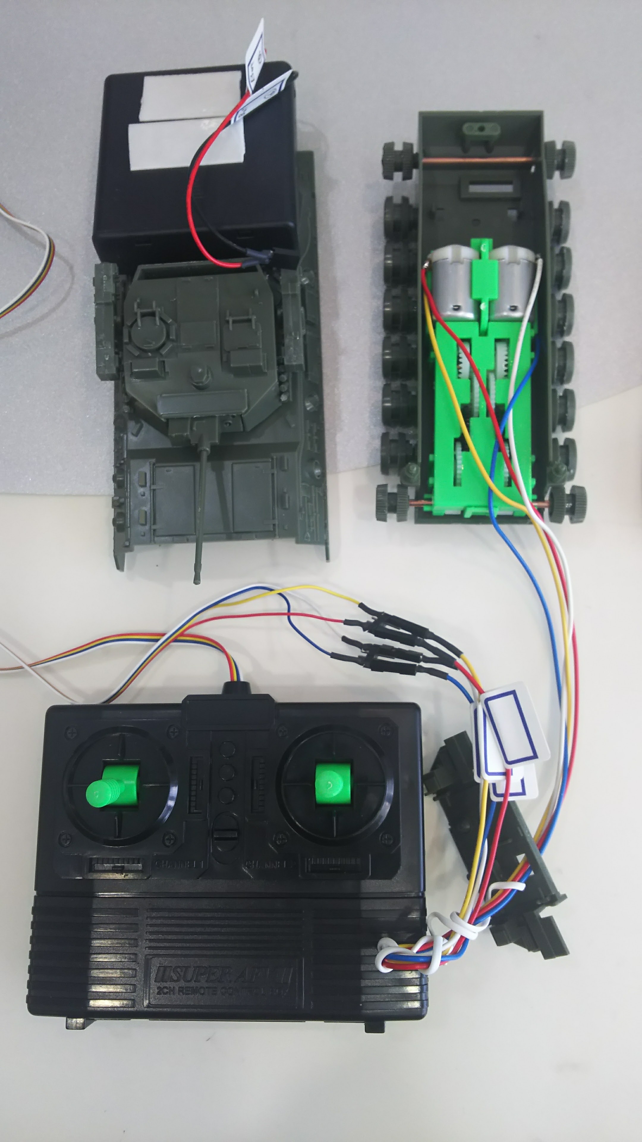 ちなみに「このタイプ」とは、2個のモータで左右のキャタピラをそれぞれ独立して動かすことができるタイプです。操作は有線のコントローラで行います。実際の戦車の操作レバーと原理は同じと聞いたことがあります。